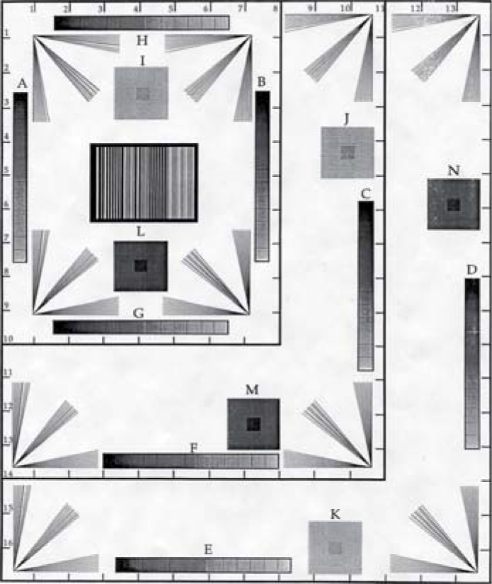 Для контроля основных параметров систем оцифровки радиографических пленок по стандарту ISO 14096-1-2005 используется стандартная эталонная пленка EPRI (сокращение от Energy Power Research Institute, США), получаемая путем экспонирования промышленной рентгеновской пленки светом. Эталонная пленка содержит специальные объекты для определения основных параметров системы оцифровки — диапазона оптических плотностей, контрастной чувствительности по плотности, пространственного разрешения. Расположение и обозначение этих объектов схематично показаны на рис. 1.