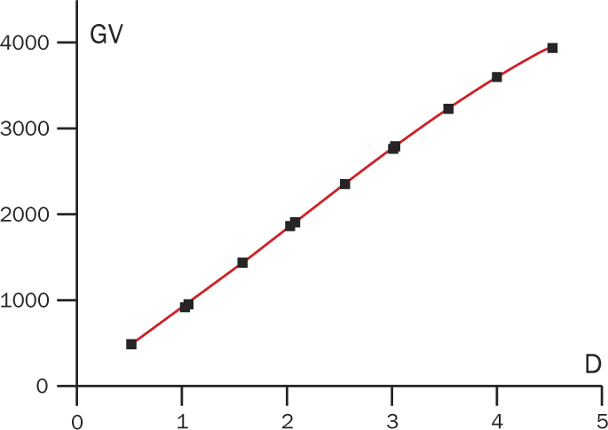 Из рис. 4 видно, что для сканера FS50B характеристическая кривая близка к линейной при D ≤ 4,0, а при D > 4,0 наблюдается отклонение от линейности. В целом кривая хорошо аппроксимируется полиномом 3-й степени. Характеристическую кривую для сканера Epson можно считать линейной лишь при D ≤ 3,0 (рис. 5).
