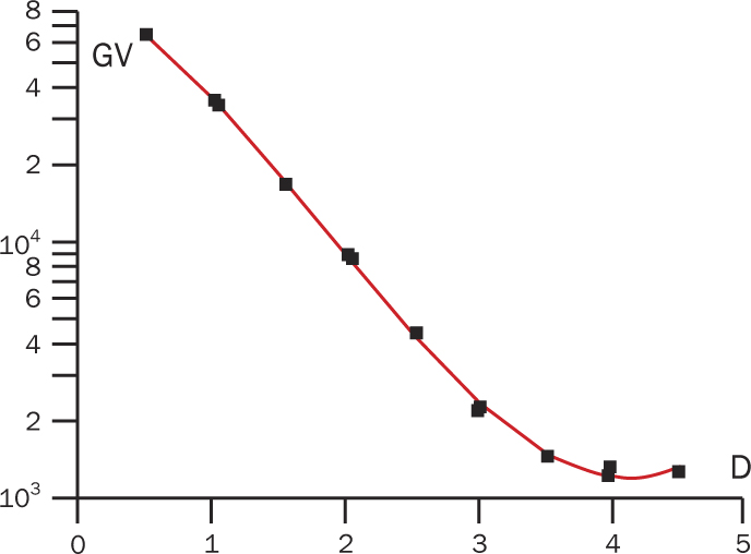 На рис. 4 и 5 показаны характеристические кривые преобразования оптической плотности в градации серого GV для сканеров FS50B и Epson. Значения GV рассчитывались по формуле 3 стандарта ISO 14096-1-2005 как среднеарифметические для выделенной области 15 × 15 пикселей в центре каждого из участков с калиброванной оптической плотностью объекта Н пленки Е356. Характеристические кривые для сканера FS50B получились одинаковыми для режимов «Высокое качество», «Стандарт» и «Высокая скорость» при прочих одинаковых условиях, указанных в подписи к рис. 4, поэтому на рис. 4 показана лишь кривая для режима «Высокое качество».