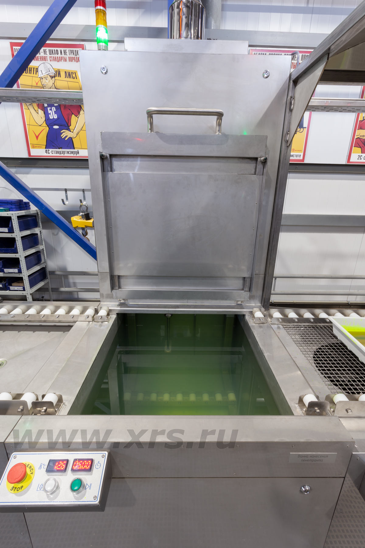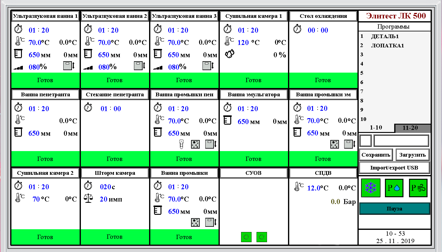 Сушка изделий производится в камере при температуре до +120 °С, затем объекты контроля остывают при работающих вентиляторах на позиции охлаждения и подаются на обработку пенетрантом.
