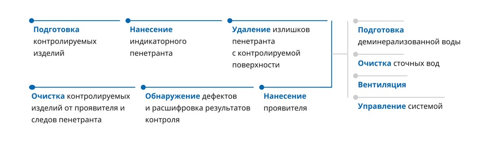 Очистка деталей после проведения капиллярного контроля осуществляется в ванне с барботажем, после чего выполняется промывка в проточной воде.