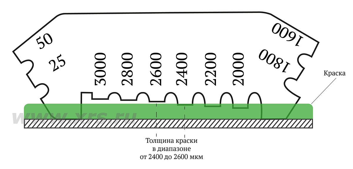 - Толщина слоя находится в диапазоне между значением последнего окрашенного зубца и значением следующего не окрашенного зубца.
