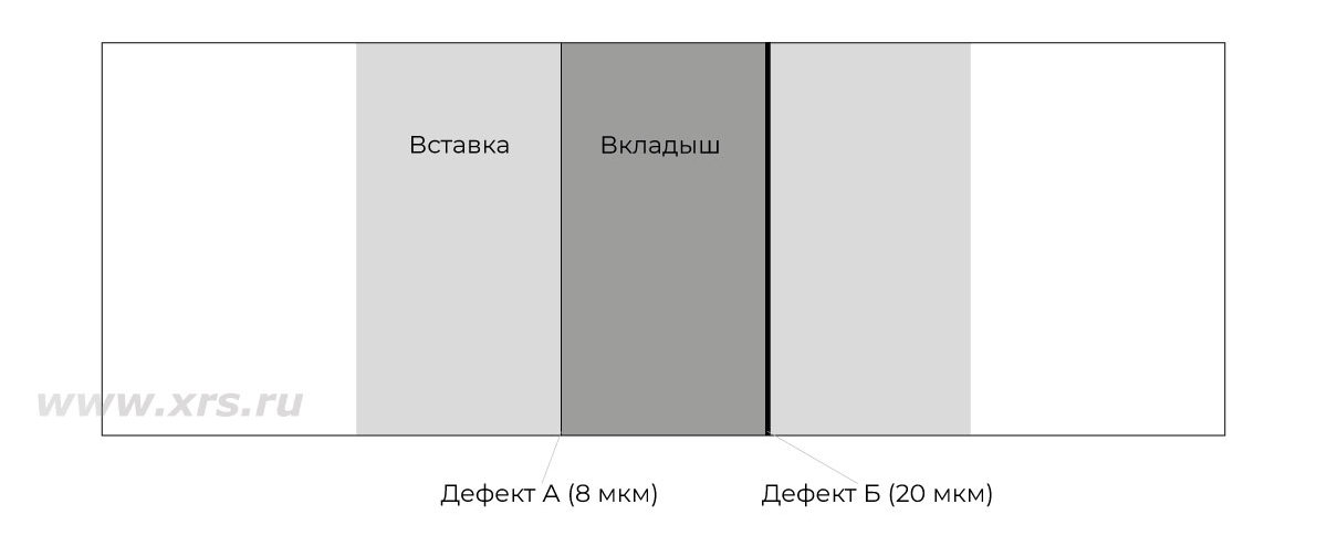 Образец представляет собой пластину со вставкой, на которой, в свою очередь, имеется вкладыш. Между вставкой и вкладышем образуются 2 поверхностных поперечных дефекта А и Б шириной 8 и 20 мкм.