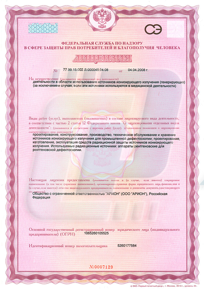 Лицензия компании «Арион» на осуществление деятельности в области использования источников ионизирующего излучения (генерирующих) (за исключением случая, если эти источники используются в медицинской деятельности).