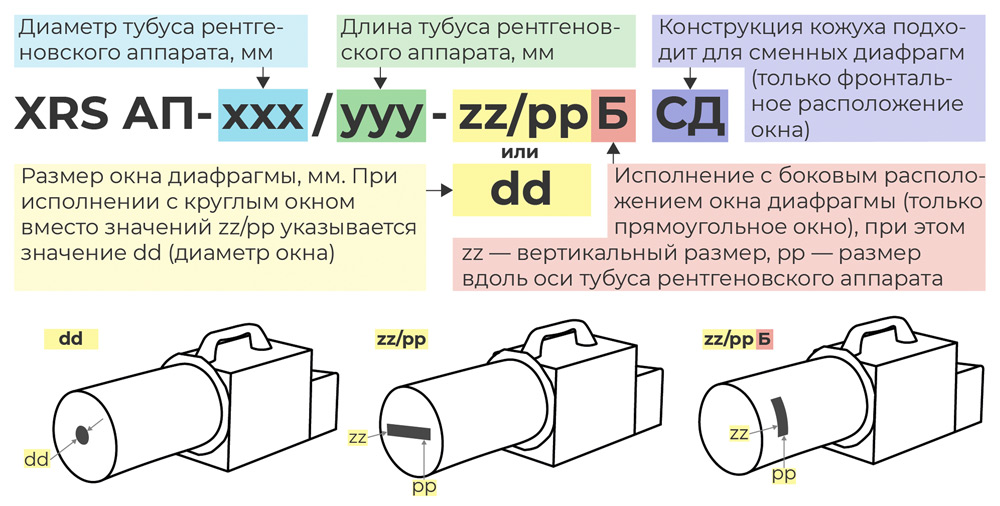 Для возможности применения кожух-диафрагм с двумя ренгеновскими аппаратами, имеющими разные диаметры и длины излучателей, использкется дополнительная переходная втулка и кольцо. При этом xxx/yyy заменяется на xxx1/yyy1-xxx2/yyy2, где первая пара размеров для кожуха без втулки, а вторая пара размеров для кожуха с втулкой.