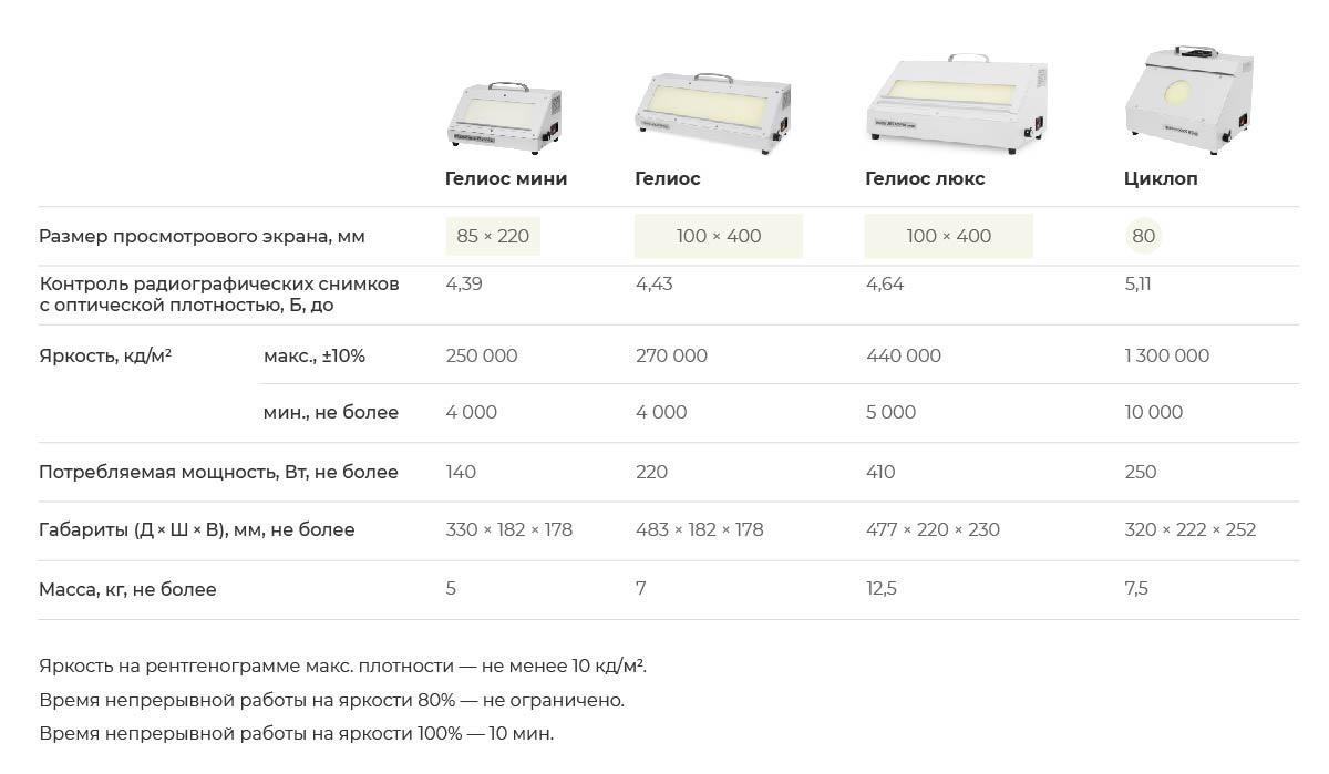 Одним из таких является негатоскоп серии XRS Гелиос люкс. В нем, при помощи сверхмощной светодиодной матрицы (с максимальным значением яркости свечения 440 000 кд/м2), реализована возможность просмотра рентгеновских снимков с оптической плотностью до 4,64 Б. Эти показатели являются уникальными среди производителей аналогичного оборудования.