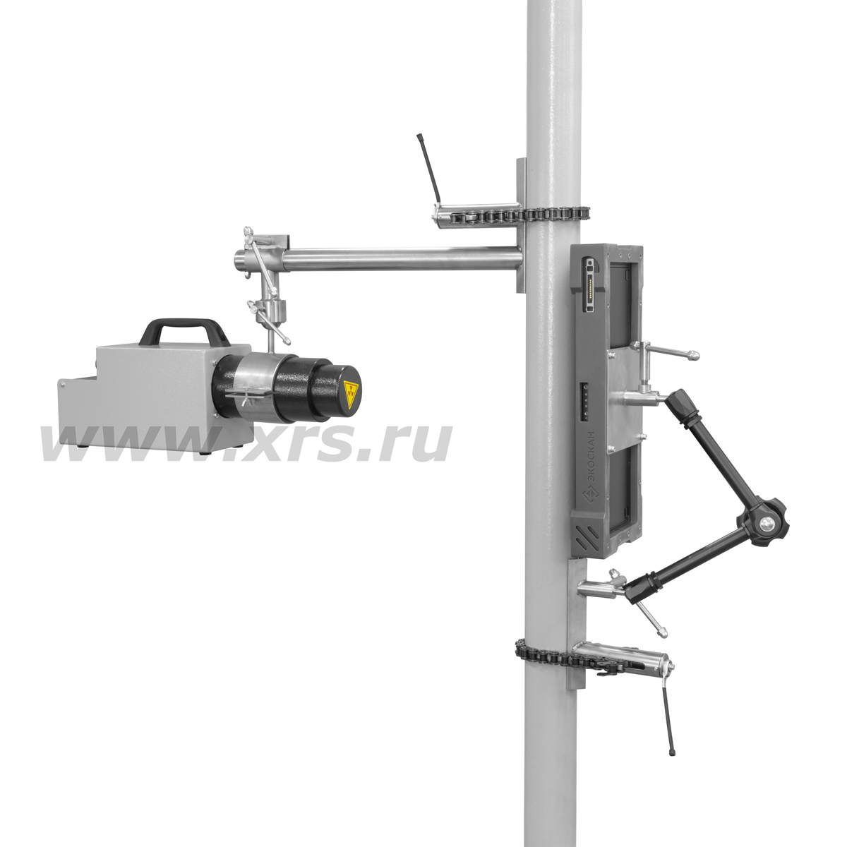 Трубный штатив АРИОН ШРТ-1М/ЭКО-10У предназначен для крепления и позиционирования плоскопанельного детектора Экоскан 10 в защитном кожухе ЭКО-10У на трубах и цилиндрических объектах контроля диаметром от 40 до 1500 мм.