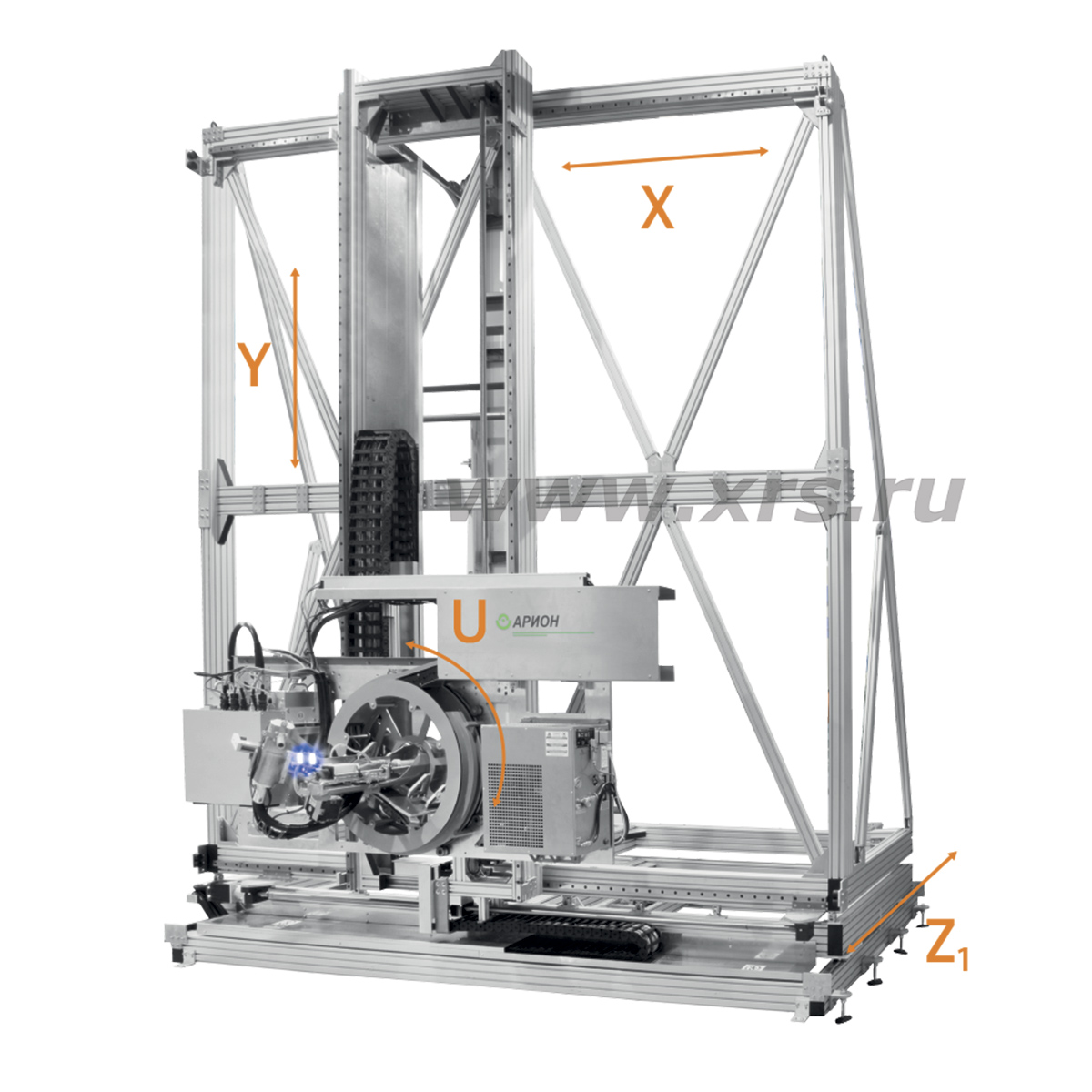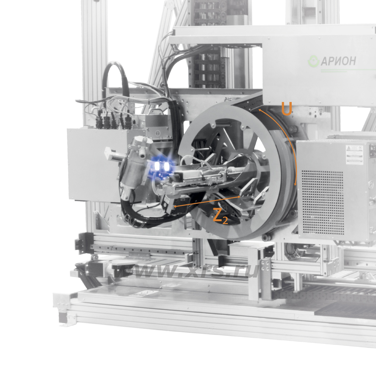 В центре поворотной турели размещена система прицеливания и автоматической подачи детектора, оснащенная приводом перемещения по оси Z₂. На секторальном С-образном манипуляторе турели установлен рентгеновский излучатель, который вращается по оси U на 360°, что обеспечивает съемку кольцевых сварных швов с заданным количеством экспозиций во всем диапазоне пространственных положений.