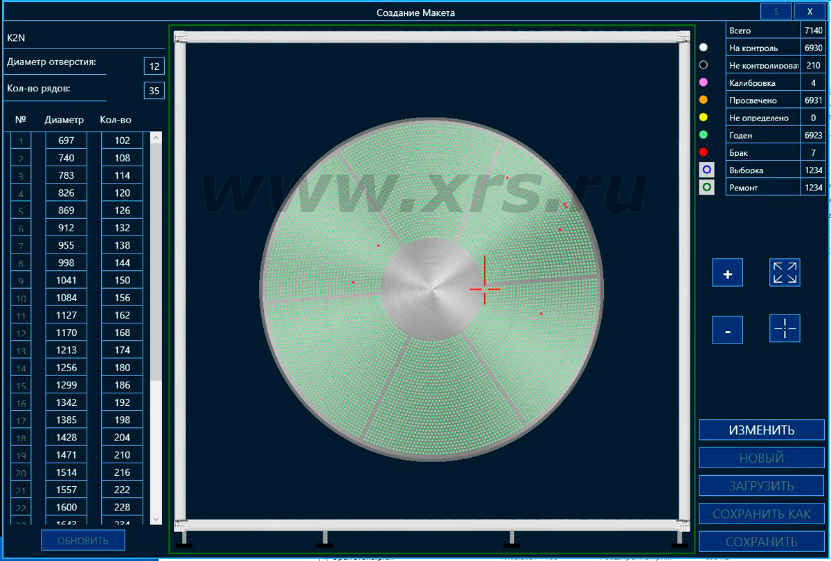 Специально разработанное программное обеспечение СУРА, служащее для управления всеми элементами системы, осуществляет работу комплекса в автоматическом и ручном режимах, а также обеспечивает расшифровку результатов контроля. В программе создается виртуальный макет трубной доски, который с помощью процедуры калибровки привязывается к реальному объекту контроля. Оператор выбирает кольцевую линию и номера отверстий, которые необходимо просветить, после чего запускается автоматический процесс контроля. Манипулятор подъезжает к заданным отверстиям и делает необходимое количество снимков. Просвеченные отверстия помечаются на макете желтым цветом. Оператор, кликнув на них, открывает полученные снимки и принимает решение о годности или браке соединения.