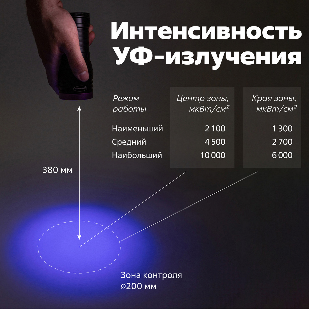 Интенсивность УФ-излучения на расстоянии 380 мм от светильника, мкВт/см²