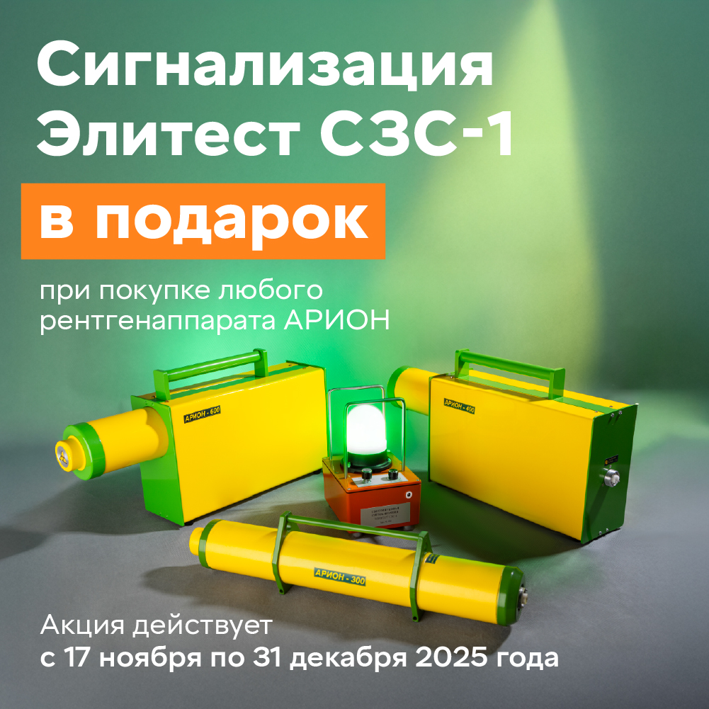 При покупке любого рентгеновского аппарата АРИОН мы дарим вам светозвуковую сигнализацию ЭЛИТЕСТ СЗС-1. Акция действует до 31 декабря 2025 года.