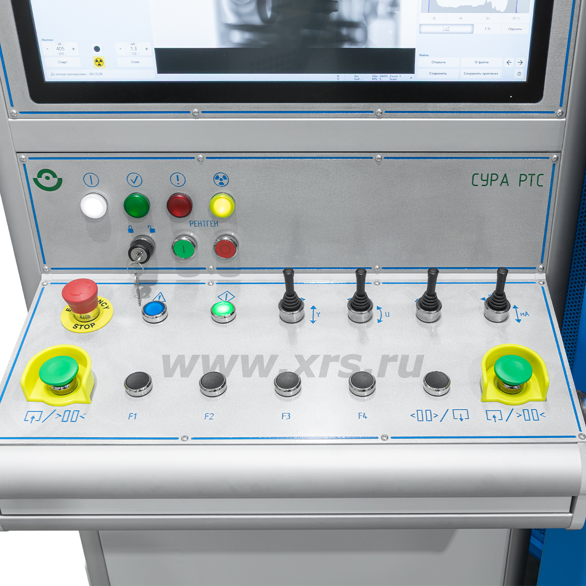 Управление работой систем осуществляется с панели оператора, интегрированной в корпус рентгенозащитной камеры. На консоли расположены джойстики перемещения манипулятора и изменения напряжения и тока, а также основные кнопки управления. Панель оснащена двумя цветными сенсорными мониторами. На главный монитор выводится изображение с детектора, на вспомогательный — либо изображение с видеокамеры, либо эталонные изображения.