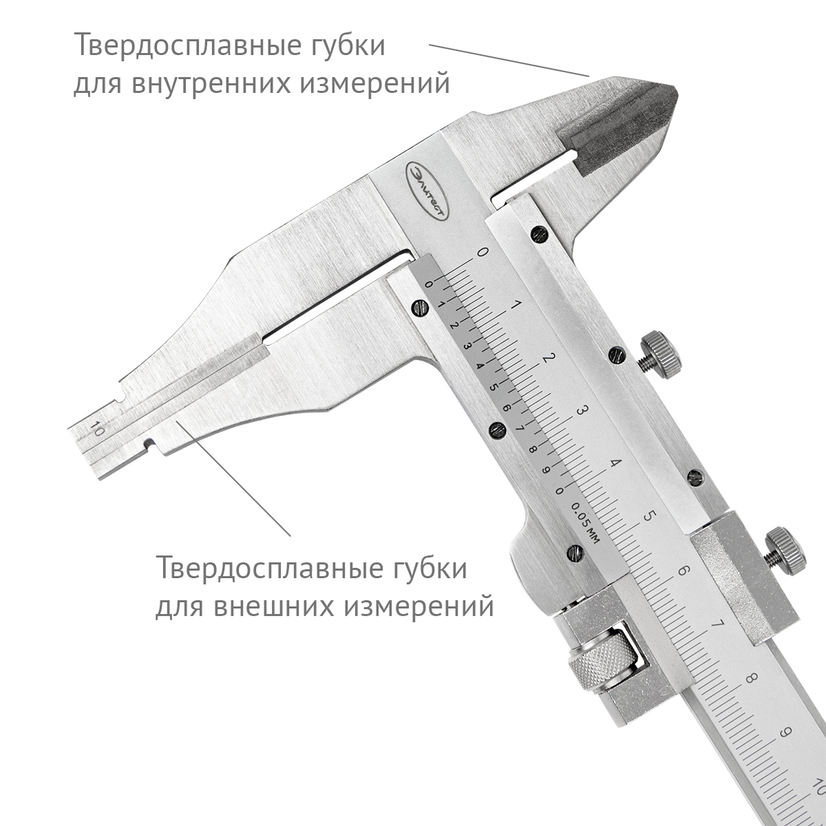 Корпус изготовлен из закаленной легированной стали, а измерительные шкалы имеют матовое хромирование покрытие, которое исключает блики, гарантируя четкую видимость делений даже при ярком освещении. Штангенциркуль соответствует требованиям ГОСТ 166–89 и ТУ 26.51.33-072-96651179-2017.